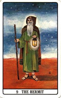 La lamina invita a meditare sul tempo ineluttabile: così il presente che tanto ci angustia tende a mostrarsi meno nero ed oscuro. Suggerisce anche di allontanarsi momentaneamente dal frastuono del mondo e ricercare nel profondo, con la meditazione ed il silenzio una realtà personale più vera. Se riferito a un protagonista l'Eremita allude ad una persona influente che può essere positiva, può operare in campo medico, psicoanalitico, ostetrico o comunque nell'ambito di una scienza meticolosa e precisa. Il consiglio della carta è prudenza, circospezione, silenzio, discrezione, riservatezza e capacità di mantenere un segreto. Se la carta compare in posizione negativa può significare mente dubbiosa, paurosa, tormentata da scrupoli che portano a tristezza, scetticismo, pessimismo e aridità. Oppure può simboleggiare una persona nemica caratterizzata da diffidenza, egoismo, temperamento malinconico o saturnino. Siate prudenti e non buttatevi a capofitto nella situazione che state vivendo, poiché questa carta consiglia prudenza, esprimendo nel contempo il concetto di occultismo e sevetezza. E la trama invisibile dell'organismo ancora da costruire, è il patrimonio genetico che viene dal passato, ma per giungere a compimento ha bisogno di essere eseguito con enorme precisione e questo si lega alla lentezza e alla pazienza. Potrete ottenere ciò che desiderate solo non bruciando i tempi e non forzando la volontà: ciò vale per ogni circostanza che state analizzando; quindi, anche in magia ci vogliono prudenza e pazienza, soprattutto perché i tempi di reazione previsti da questa carta sono molto lunghi.