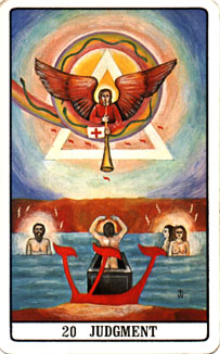 L'arcano indica la resurrezione dello spirito purificato. Significa giudizio e ricorda che saremo chiamati a rispondere delle nostre azioni e di tutto ciò che potevamo fare e non abbiamo fatto. L'Angelo allude alla rinascita, alla comunicazione con la divinità, ritrovamento della salute e soprattutto ispirazione. La carta può indicare chiaroveggenza, profetismo e superamento di uno stato puramente naturale. Se l'arcano compare in posizione negativa può indicare un falso profeta o un apostolo esaltato, sovraeccitazione nervosa, isterismo, eccessi e instabilità. Questa carta conduce verso scelte elevate dal punto di vista spirituale: è l'iniziazione estrema, è l'uomo che comunica col divino e può essere profeta, conseguentemente mette in movimento situazioni che possono anche sembrare inattese, che si esprimono sia nel bene che nel male. Il fatto che si annuncia è perciò imprevisto, slegato dai precedenti, e non può essere conosciuto soltanto con questa carta, ma occorrerà ripetere il gioco dei numeri per approfondire l'argomento che vi sta a cuore. Questo però significa anche novità in arrivo. Dal punto di vista della magia è bene non azzardare scelte con questa sola carta come risposta ai propri quesiti.