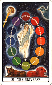 Il Mondo indica realizzazione, raggiungimento di un obbiettivo. Simboleggia l'esaltazione del creato e la potenza suprema dello spirito che conferma il coronamento di un'impresa. La carta indica un successo duraturo, una riuscita completa, l'adempimento di un compito spesso realizzato in collaborazione con una comunità. Il Mondo indica ancora il sentiero della liberazione, un esito favorevole degli avvenimenti, anche a dispetto di altre indicazioni. Se la carta compare in posizione negativa indica fine di un ciclo vitale, destinato a ricominciare con un altro ciclo. Indica un movimento a vuoto, la vanità degli sforzi umani di fronte al fatto. La carta forse più benefica di tutte, perché significa letteralmente: cosmo, universo, regno di Dio, tempio ideale, totalità, perfezione, scienza e conoscenza integrale, potenza spirituale ed estasi. là l'apoteosi di ogni cosa e prevede successo in ogni iniziativa, dà sicurezza al consultante e lo premia delle proprie scelte. La riuscita sarà completa e l'opera intrapresa sarà coronata dal successo, non temete quindi gli ostacoli perché saprete superarli. Questa carta indica che probabilmente non dovrete ricorrere all'uso della magia, ma se lo farete avrete il successo che annuncia, inoltre indica che non siete circondati da nemici e negatività.