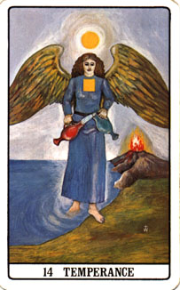 La Temperanza simboleggia il continuo fluire della vita, il rinascere dopo la morte, l'energia vitale che non si disperde ma è come liquido continuamente versato da un contenitore ad un altro per divenire fonte di rigenerazione. la carta indica moderazione, serenità e impassibilità di fronte alle piccole noie, arrendevolezza, sincerità genuina, e tutti i significati della dolcezza e della vitalità. Se la carta compare in posizione negativa, può significare freddezza, passività, apatia. Abbandono alla pigrizia e alla imprevidenza. Noia esistenziale, mancanza di vitalità, pericolo di una grave depressione nervosa. uesta carta esprime la serenità dello spirito, che sa sollevarsi al di sopra delle miserie umane. Indica la capacità di conciliare molte virtù, fra cui la pazienza e l'energia mediatrice della natura, senza per questo agire in maniera troppo attiva. La persona o la situazione a cui si riferisce si presenta priva di eccessive ambizioni, ma capace di mediare le forze naturali che risiedono in ogni organismo vivente, fra cui la taumaturgia, cioè la capacità di curare e lenire ogni male. Lo spirito d'adattamento, l'elasticità rendono possibile ogni situazione, per cui la magia non sarà certo la soluzione adatta a risolvere il problema che si presenta, ma un forte pensiero filosofico sarà alla base della soluzione.